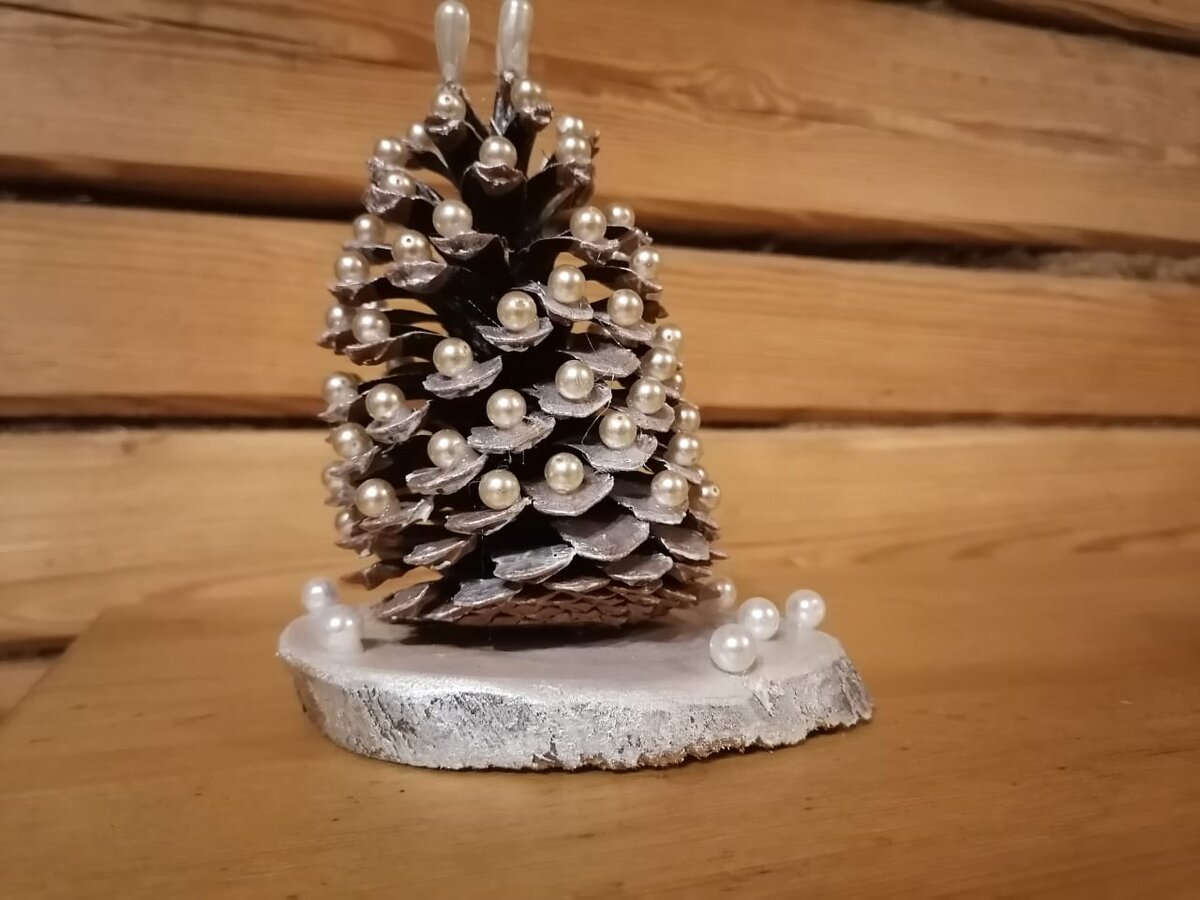 - После того как наша шишку высохла, можно начинать ее украшать . Приклеиваем бусинки на чешуйки шишки.