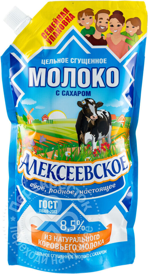 Сегодня мы проверим качество и вкус сгущенного молока Алексеевское. Сгущенка в мягкой упаковке, пачка семейная большого размера. Сделана по ГОСТ из натурального молока с добавлением сахара. Жирность 8,5 %. Мы видим, что написано молоко, а это значит, что кроме цельного молока, ничего другого похожего на молоко там быть не может, только молоко и сахар. Вообще сгущенное молоко придумали вместе с