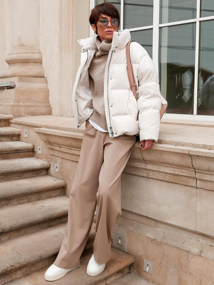 Отличную идею нам дает Виктория Соловьева (@victoria_solovyeva). Она носит белую куртку с прямыми брюками классического кроя и ботинками в спортивном стиле. Чтобы уравновесить все в едином образе, Виктория круто сочетает всего лишь два цвета – белый и бежевый. А еще заметьте, как небрежно, но при этом круто из-под свитера выглядывает рубашка? Такой комплект, я думаю, будет уместен для женщины любого возраста. К тому же в нем точно будет комфортно.
