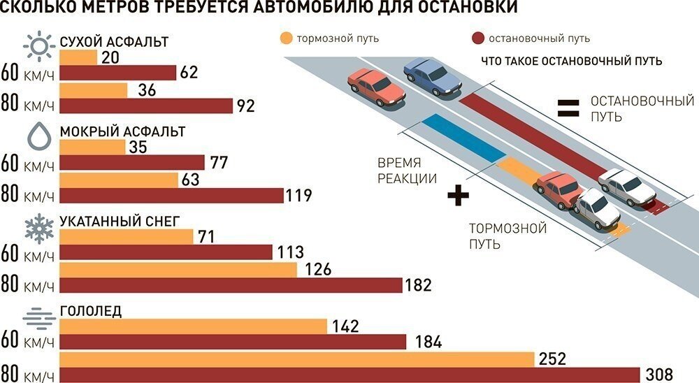 Ваш тормозной путь на снегу и льду значительно увеличивается по сравнению к тому, которому вы привыкли при сухой погоде. Подъезжать слишком близко к авто перед вами мягко говоря плохая идея, потому что вы просто не сможете вовремя остановиться. Убедитесь, что вы держитесь на должном расстоянии от впереди идущей машины.