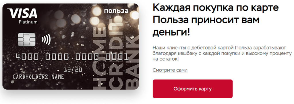 По состоянию на 2020 год среди всех многочисленных предложений банков по дебетовым картам с повышенным начислением процентов на остаток особенно выделяется карта Хоум Кредит банка, которая носит название «Польза». Карта действительно, имеет «полезные» условия, которые делают ее, пожалуй, самой привлекательной картой-копилкой в 2020 году!