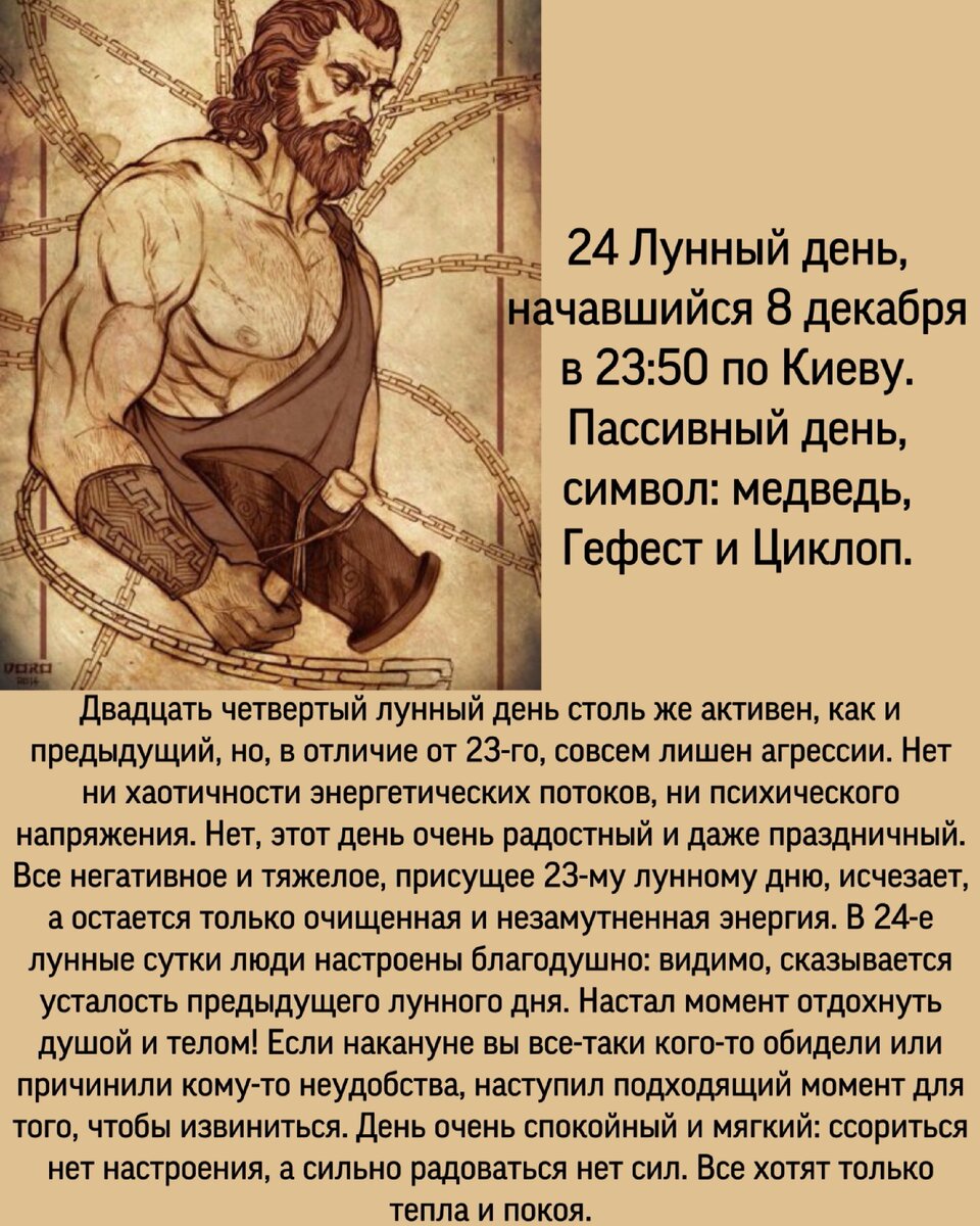 Сегодня наше тело находится под контролем разума. Двадцать четвертый день — день пробуждения и трансформации мужской энергии. Ранее этот день был связан с фаллическими культами. Так что сегодня удачное время для интрижек, интимной близости и зачатия ребенка. Супружеские отношения наполняются теплотой.