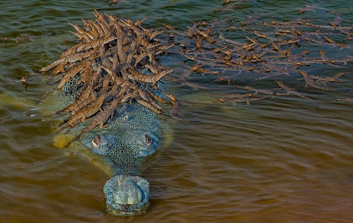 На снимке, сделанном в Национальном заповеднике Чамбал на севере Индии, гавиал перевозит на себе целую сотню детёнышей, рождённых от