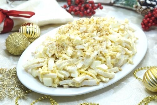 Салат с кальмарами «Снежный ангел» готов. Можно подавать к праздничному столу.