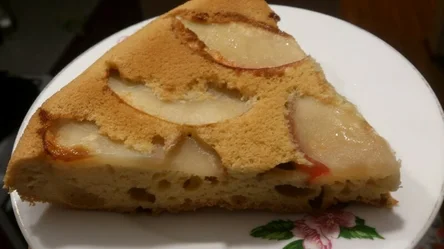 Форму для выпечки застелить пергаментом, смазать маслом без запаха, выложить яблочные дольки. Залить жидким тестом.