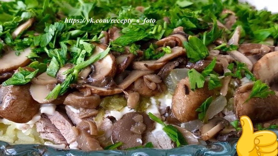 4. Огурцы натрите на мелкой терке и распределите на слое мяса. Сверху выложите обжаренный остывший лук (тонким слоем). Сверху выложите грибы, слой можно смазать майонезом.