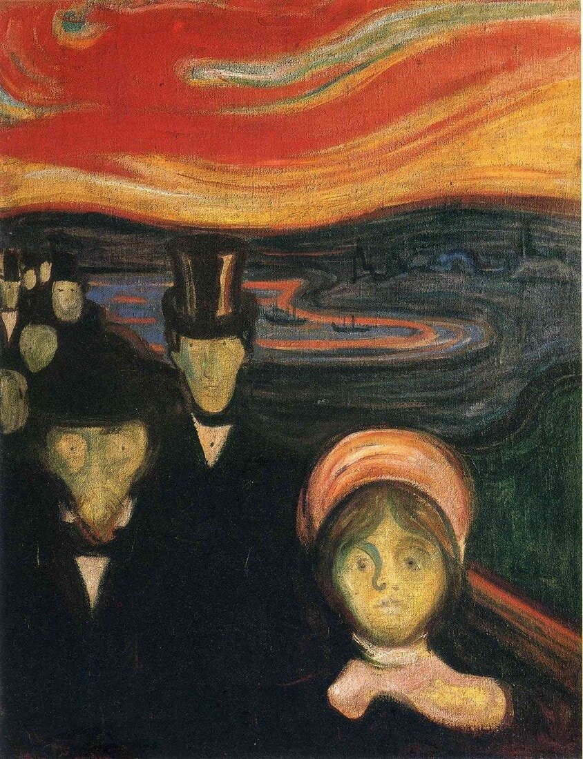 Автору картины не требуется думать, как передать это состояние, он - экспрессионист, он и есть эмоция. Если присмотреться, то женщина на переднем плане выглядит очень встревоженной, но у мужчины слева тревога будто смыла человеческие черты лица, оставив широко открытые глаза. Другие же люди представлены совсем размыто, их будто бы нет, их будто бы уже поглотила тревога.