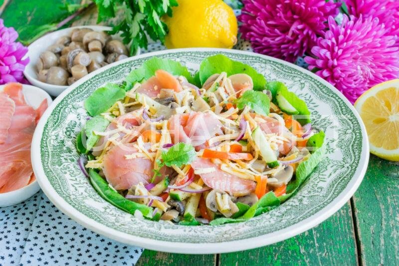 Приготовим сегодня невероятно вкусный итальянский салат «Портофино» с копченым лососем и маринованными шампиньонами. Это быстрое и легкое в приготовлении блюдо отлично подойдет как для легкого семейного ужина, так и для праздничного стола. Салат имеет пикантный вкус и аппетитный вид, получается сытный, но достаточно низкокалорийный. Именно поэтому этот рецепт оценят те, кто следит за своими