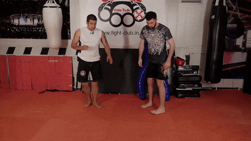 Все упражнение состоит из двух шагов: сделав первый шаг в сторону мы разворачиваем корпус и смотрим на противника, а именно в то место, куда собираемся бить. На второй шаг мы делаем сам удар ногой, который пока что мы не рассматриваем.