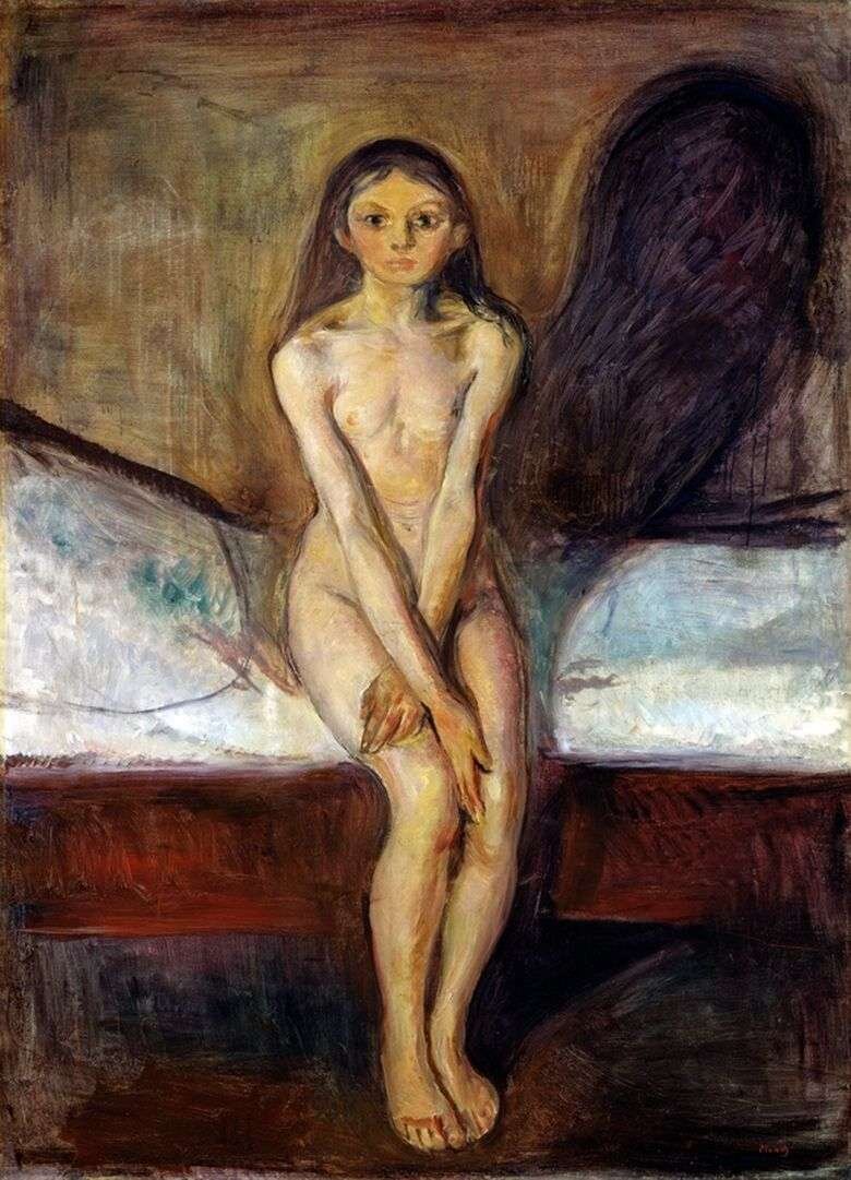 Мунк не любил рисовать пальцы, грудь, ноги, поэтому на картине видно неловкость не только самой девочки, но и автора, который ее писал. В девочке на картине совершенно отсутствует хоть какая-либо порочность, она представляется довольно невинной, хоть и показана обнаженной. Девушка изображена в темных тонах, да как и большинство картин Мунка. Если жизнь - мрак, то и на картинах вы увидите тоже самое, ведь картины - отображение души художника.