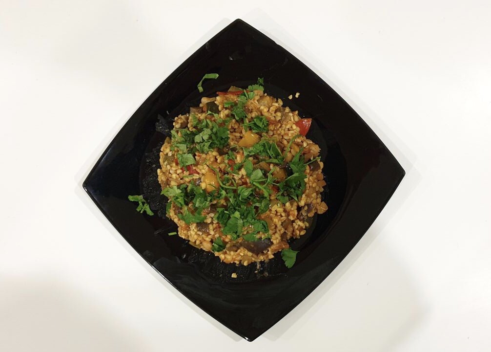 - Пока мы всё это готовили, наш булгур должен был свариться. И теперь его тоже добавляем к овощам.