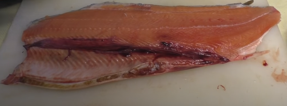 Подготовим филе, очищаем его от костей плавников кожи и прочего, затем нарезаем его крупными кусками.