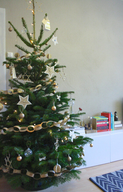 В продолжение звездной темы я сделала несколько украшений-звезд из половинок деревянных шпажек, склеенных на концах с помощью декоративного скотча. Звезда, украшающая верхушку елки, была сделана тем же способом, но из целых шпажек.