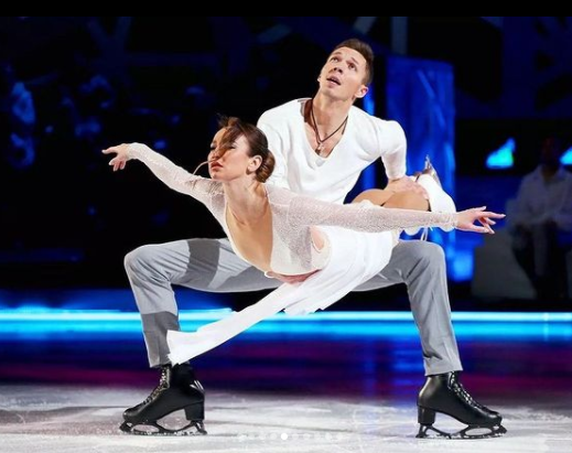 Внизу стоят Ольга Бузова ( в белом и с цветами) и Дмитрий Соловьев (в черном). Они остановились у подножья пьедестала. У Ягудина тоже был снимок с финала, где на дальнем плане видны Бузова и Соловьев. Цветом одежда сходится.