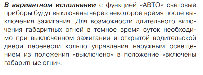 Второе неоднозначное решение (на машинах с функцией АВТО) - это задержка выключения световых приборов после выключения зажигания. Логика вроде понятна - дать возможность в темноте хотя бы понять, куда идти.