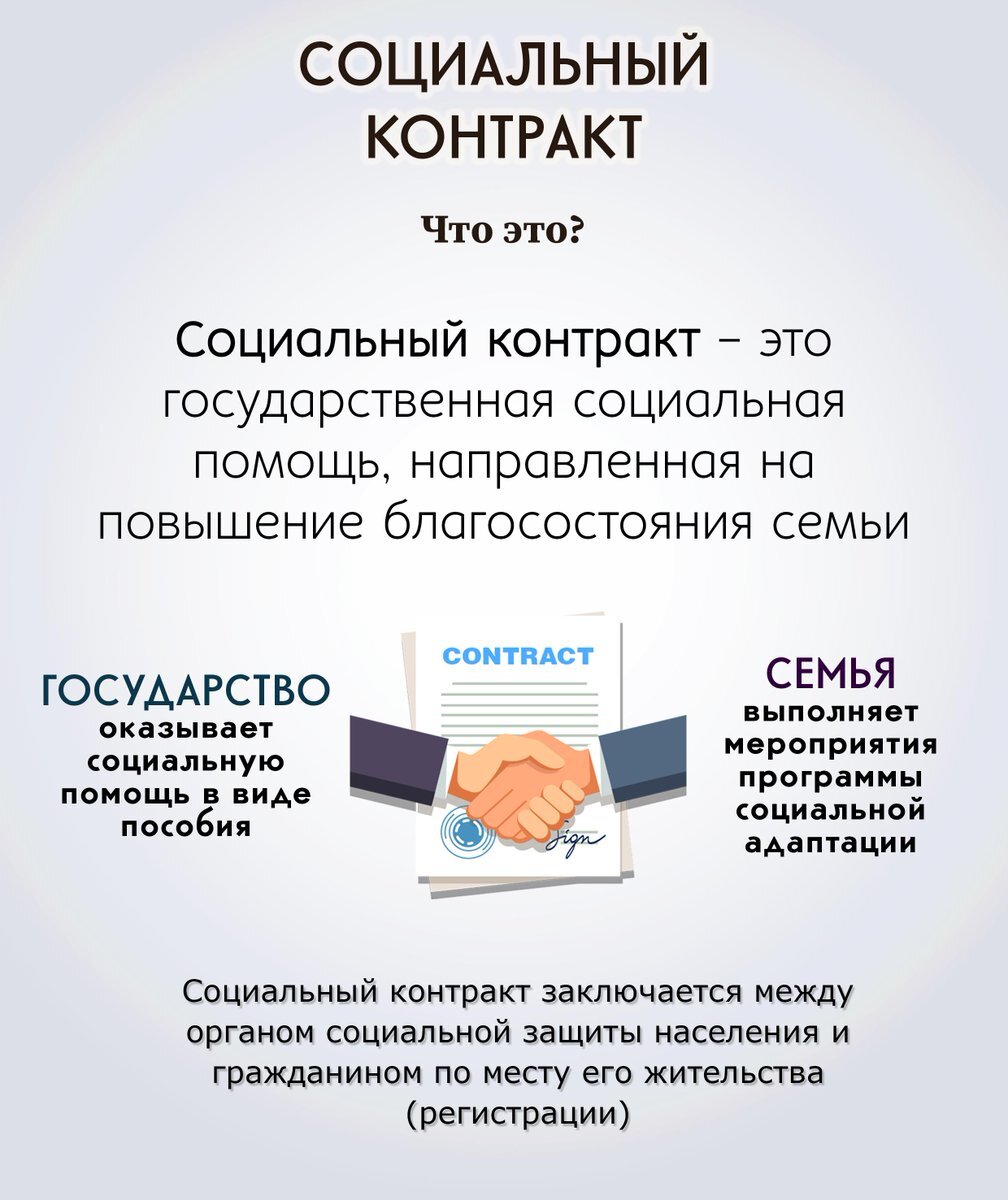Что такое Социальный контракт? Социальный контракт – это соглашение, которое заключается органами соцзащиты с гражданами и семьями, доход которых по независящим от них причинам ниже прожиточного минимума, установленного в соответствующем субъекте РФ. Оказание социальной помощи малоимущим семьям на основании социального контракта предусмотрено статьей 8.1 Федерального закона № 178-ФЗ. Конкретные условия контракта и перечень мер соцподдержки утверждают субъекты РФ. С 4 сентября 2020 вступало в силу Постановление Правительства РФ от 19 августа 2020 г. № 1258 , которым Михаил Мишустин расширил возможности поддержки одиноких граждан и семей по социальному контракту. Финансовая помощь предоставляется в виде ежемесячного пособия или единовременной выплаты. В каждом конкретном случае сумму определяет экспертная комиссия. Деньги можно потратить на: Важно! денежные средства должны быть использованы только на мероприятия, связанные с выполнением обязательств по социальному контракту. В подт