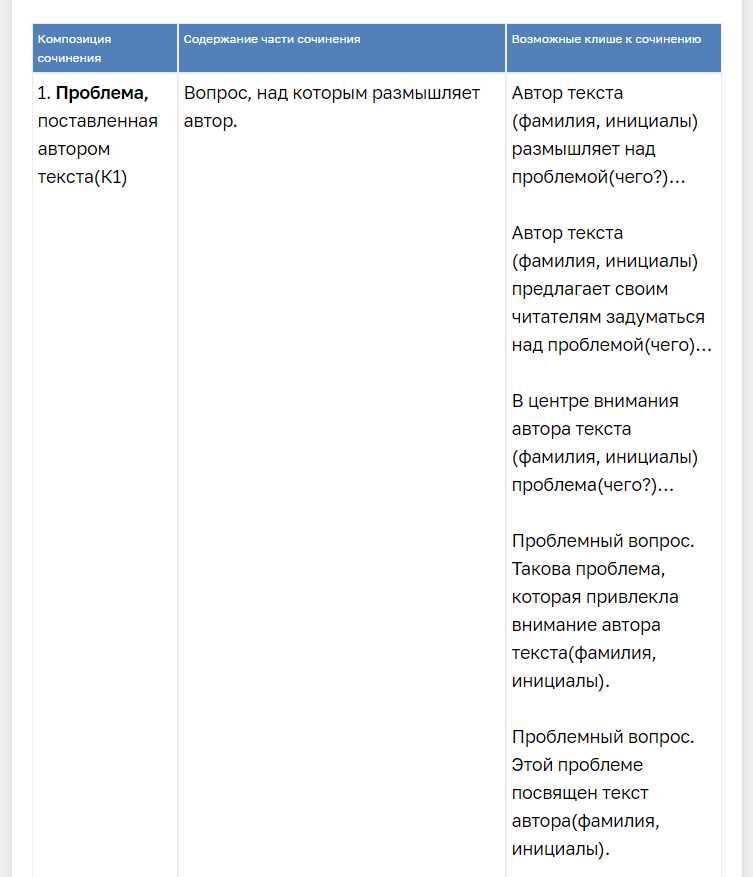 Таблица-шаблон к сочинению по русскому языку на ЕГЭ-2021