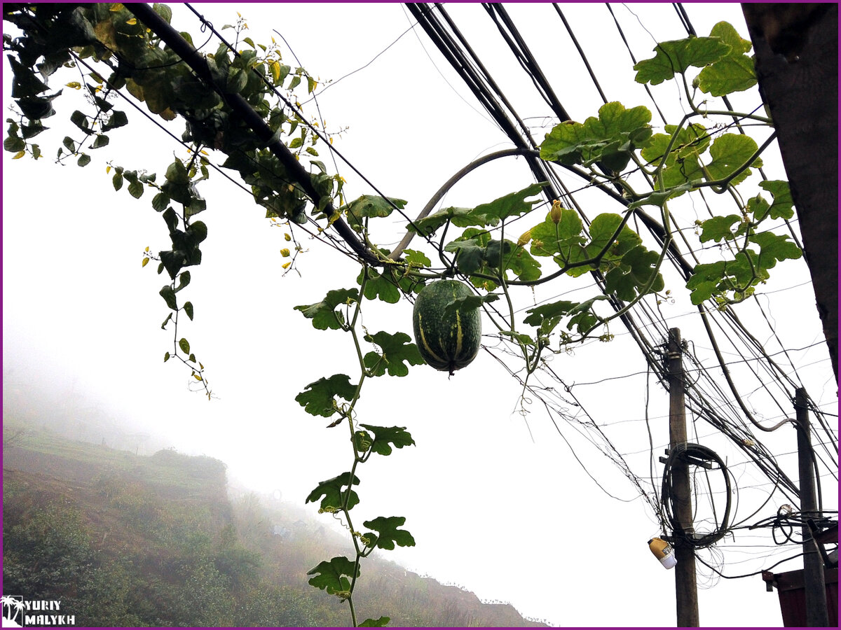 Выхожу утром, сонный, из дома вьетнамской семьи, где я остановился заночевать во время моей охоты на цветущие вишни, а над головой висит огромная тыква! Не буду обманывать, позже я узнал, что этот плод называется "зимняя дыня", но по-моему это обычная самая тыква. Причем здоровая такая.