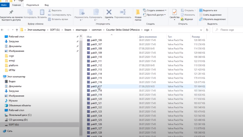 Делается это достаточно просто. Для этого вам нужно будет перейти в корневую папку с игрой. Найти ее вы сможете по адресу: мой компьютер/локальный диск С (или где у вас находится стим с CS:GO)/Steam/steamapps/common/Counter-Strike Global Offensive/csgo. В последней папке листайте файлы вниз. Там вы найдете множество файлов с подписью pak01_… Вам понадобится файл, под названием pak01_117.