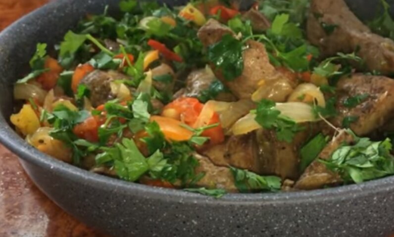 Важно. Мягкость печени зависит от времени тушения и прожарки. Поскольку печень считается нежным продуктом, готовится она очень быстро. Открою секрет, чем дольше продукт поддается термической обработке, тем жестче он становится. Здесь главное правильно выдержать все процессы, тогда вы получите удивительно сочную и нежную печень, которая насыщается свежим ароматом овощей и пикантностью острого перца.