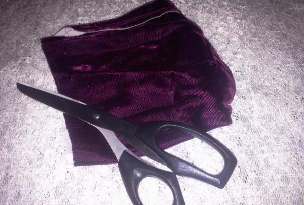 Из бархатной ткани вырезаем полоску для будущего мешочка, то есть размер мешочка определите сами, после чего лавсановой нитью делаете наброски, подвернув ткань для шнурка.