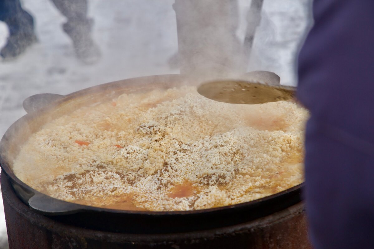 И обычный будничный день может вдруг стать интересным и вкусным, особенно когда в воздухе витает запах ароматной пищи. А готовят ее кулинары в казанах прямо на улице Кызыла на всеобщем обозрении. А прохожие останавливаются: кто-то — чтобы спросить: а что у вас тут происходит? Другие — поинтересоваться рецептом настоящего узбекского плова. «Так вот, значит, как надо делать, чтобы соль равномерно распределялась… рис в соленой воде…понятно», - восклицали иные.