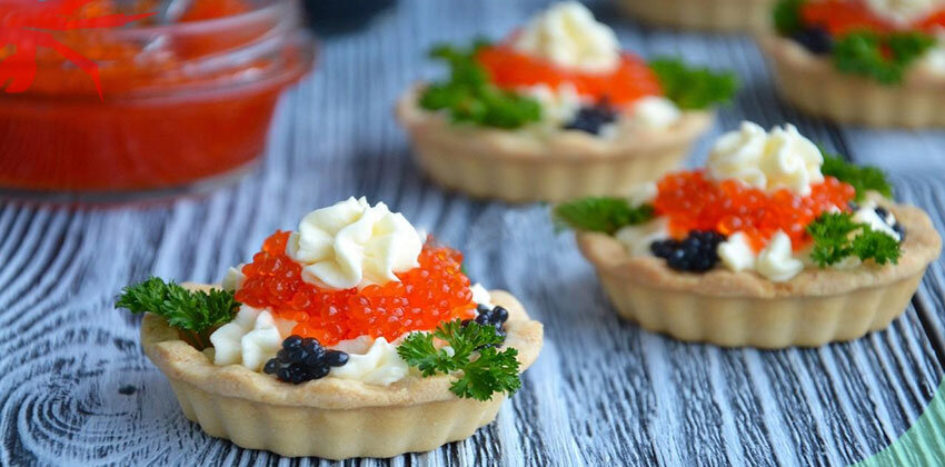 На дно тарталеток выложить твердый сыр, затем с помощью кондитерского мешка по периметру выкладываем розочки из плавленого сыра. По центру выкладываем красную икру. Сверху на икру, по центру выложить еще одну розочку из плавленого сыра. Украшаем тарталетку петрушкой, черной икрой. Блюдо готово. Приятного аппетита!