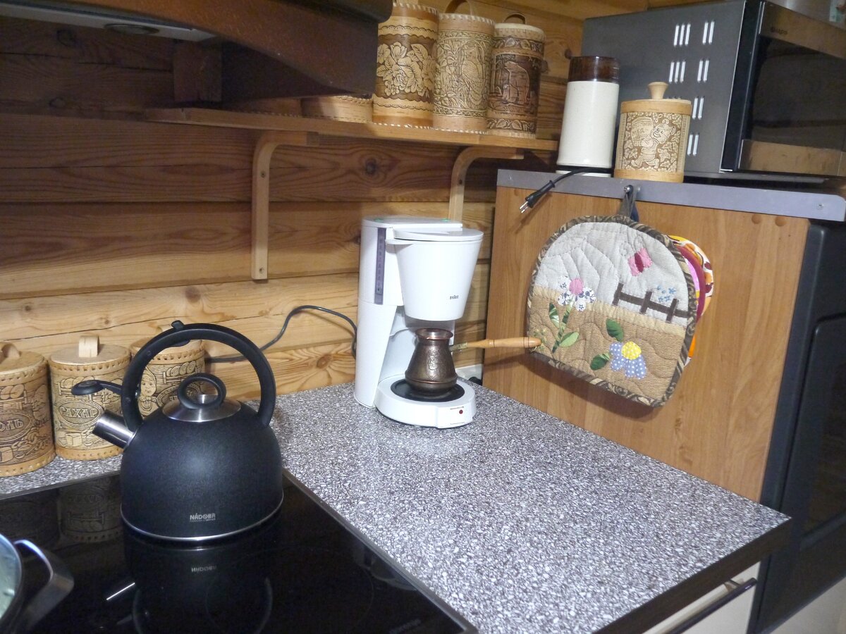 На моей кухне долгое время кофеварка стояла в углу, слева от мойки. А банка с кофе, кофемолка и плита с чайником в противоположном правом углу. Почему я их разлучила не понятно. Наверное просто не подумала.