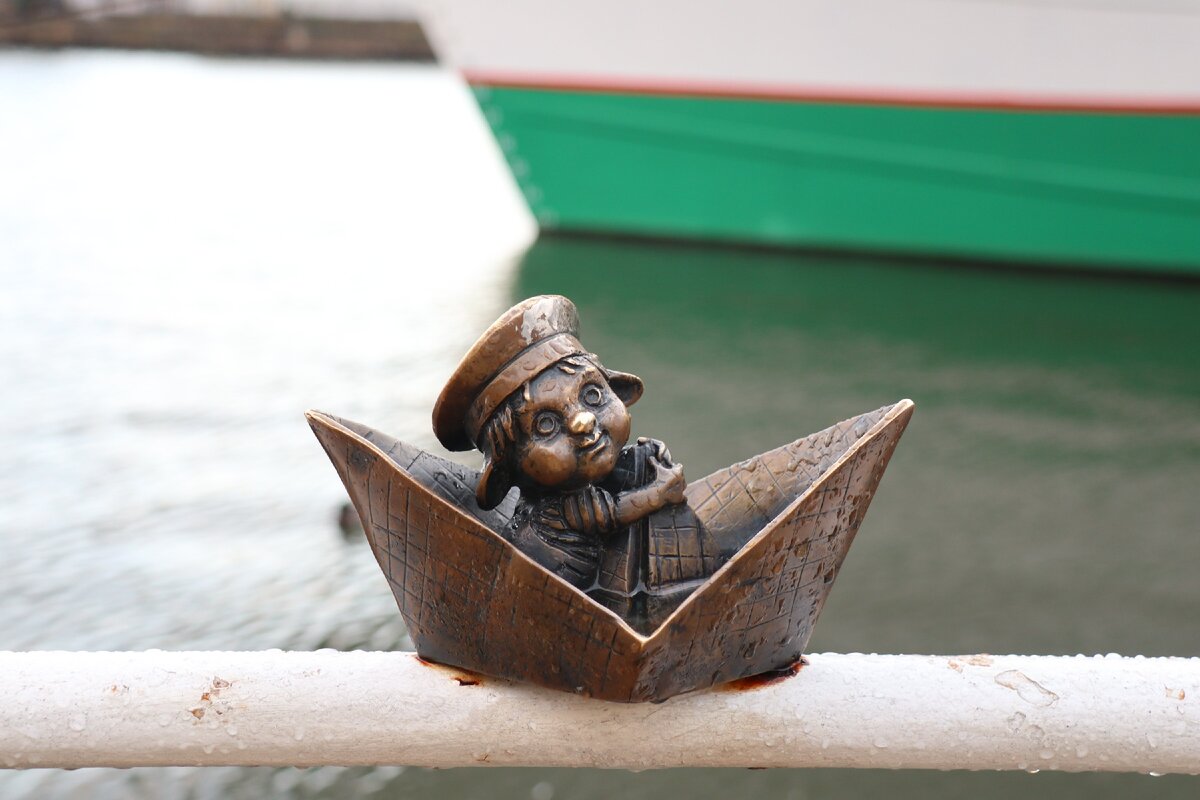 Еще в семье двое деток. Это малыш, который задорно бороздит море на бумажном кораблике (находится на перилах набережной рядом с музеем Мирового океана). И есть малышка Уля, которая задорно едет на улитке и показывает всем язык – дети – такие дети! Найти Улю можно на ограде зоопарка.