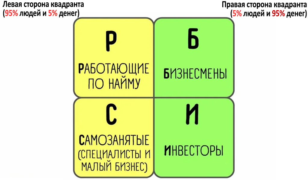 Квадрант денежного потока представляет собой четыре возможных состояния человека, с точки зрения зарабатывания денег. Схематично это выглядит так.