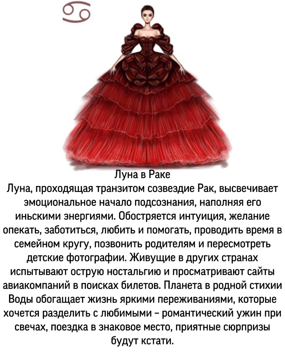 Работа. Этот период успешен для психологов, педагогов, семейных врачей. Эти дни также благоприятны для всех, чья работа связана с интуицией, эмоциональным выражением, женщинами, младенцами, продовольствием, домом, жидкостями, особенно - молоком. Для мужских профессий это положение Луны является слишком эмоциональным, женским, иррациональным и сентиментальным.