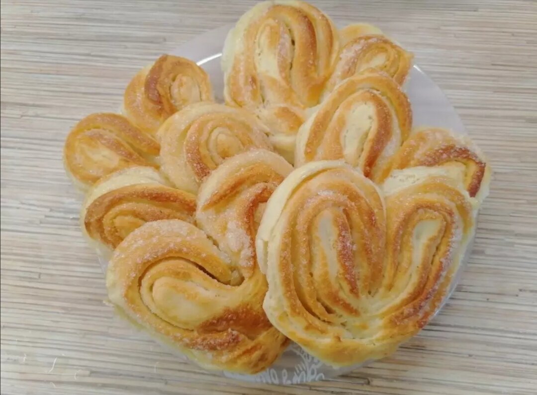 3) Растапливаем 50 гр. сливочного масла. Подошедшее тесто делим на 12 равных частей, каждую часть раскатываем в пласт, смазываем растопленным сливочным маслом, посыпаем 2 ч. л. сахара и сворачиваем в рулет. Рулет складываем напополам, между собой защипываем края и разрезаем рулет на ⅔, разрезанные части выворачиваем и получается сердечко. Оставляем на 20 минут на расстойку в слегка подогретой духовке.