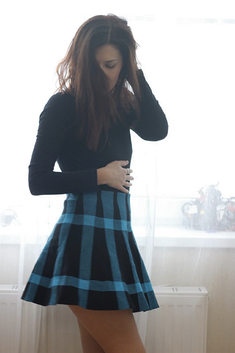 Длина чуть ниже колена, плиссировка. Покупала в Sinsay за рублей 600. В принципе универсальная модель - носи с чем хочешь: рубашками, блузами, кофтами, водолазками. Но все же, юбка легко может испортить образ, превратив его в слишком «учительски-бабушкин» что ли... То есть сильно «старит», если не с тем одеть.