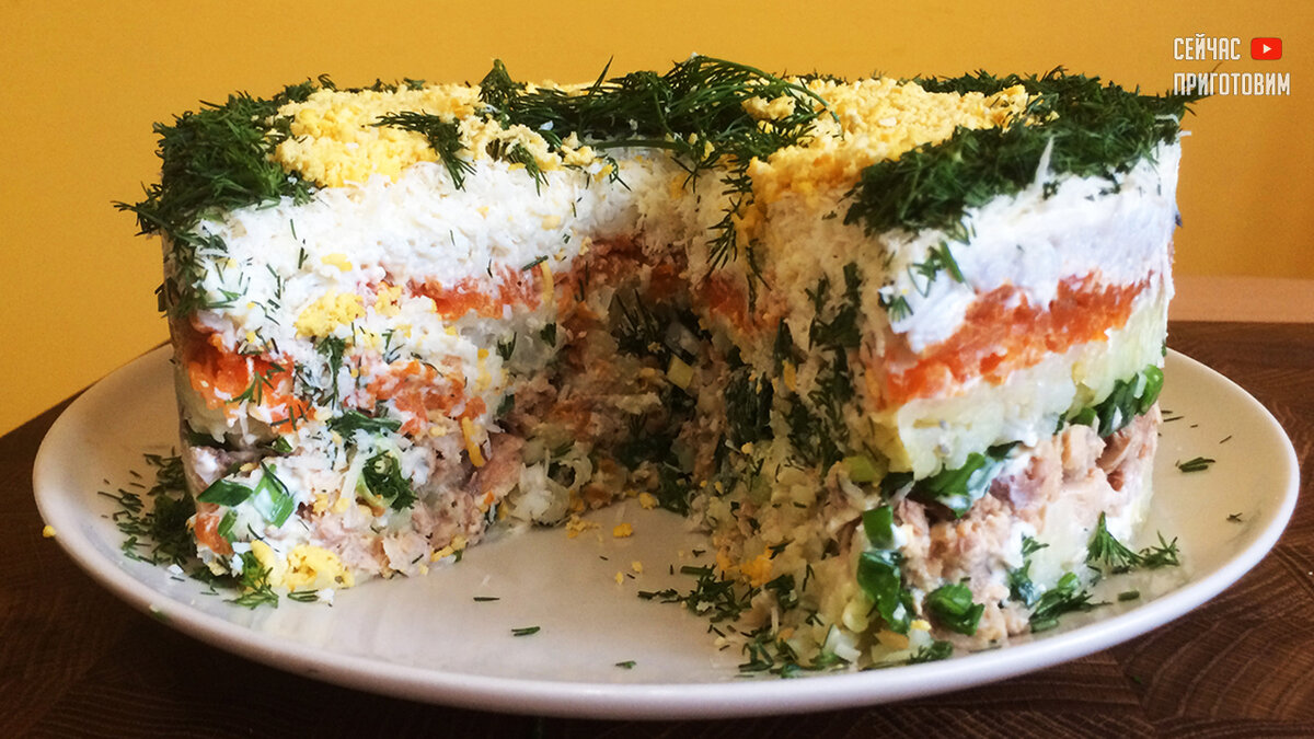 Перед подачей на стол достаем салат из холодильника, снимаем пищевую пленку и разъемную форму.
