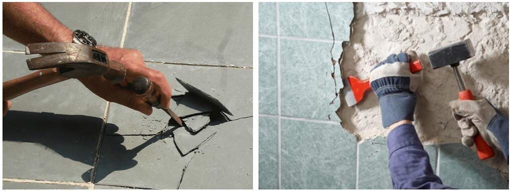 Перед началом работ пол простукивается деревянной киянкой для обнаружения слабых мест конструкций. Также легкие удары способствуют увеличению пустот под кафелем. С самого слабого участка начинается поднятие плитки.