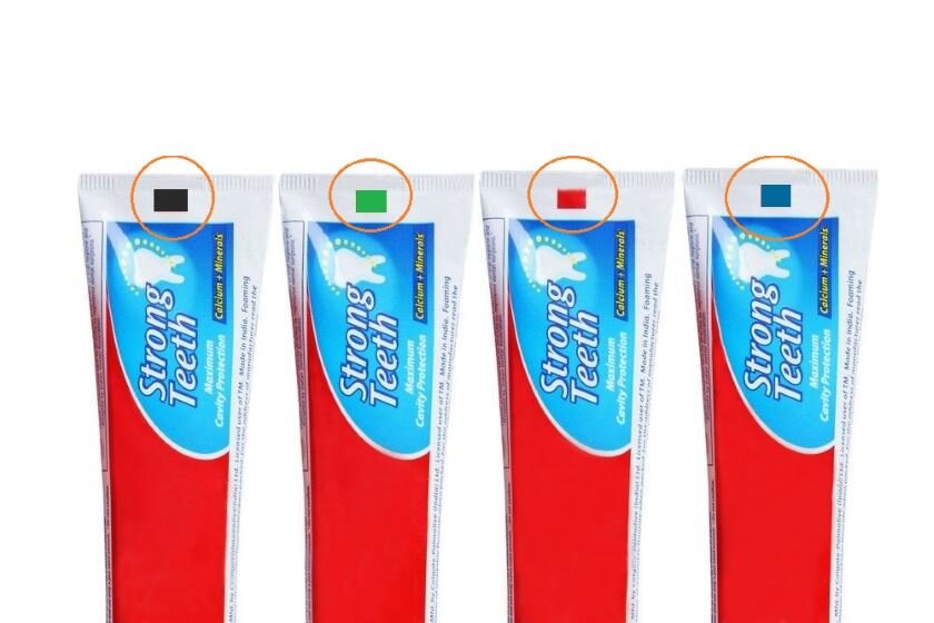 Для технологического процесса, необходимо указывать места обреза тюбика, и для этого используют цветные маркировки, которые чаще всего совпадают со штрих кодом. Темные цвета лучше всего считываются, поэтому используют именно эти цвета.
