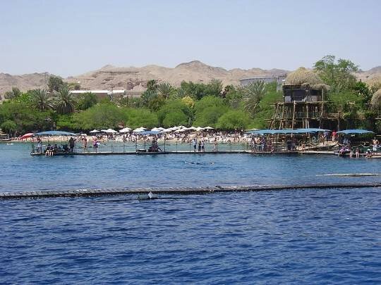 Дельфиний риф, лежащий в окружении гор и пустыни, утопает в зелени и более похож на тропический оазис: высокие деревья, цветы, много тени. Дорожки ухожены, всегда найдутся свободные стулья и тенты. Следить за происходящим в воде можно прямо с песчаного пляжа, где расположены закусочная и ресторан. Ещё более удобная точка наблюдения – высоко поднятая над пляжем конструкция из стволов деревьев, этакий дом на дереве. Тут есть ресторан, терраса, три бассейна. За отдельную плату можно полностью расслабиться во время флоатинга: под тихую музыку девушка плавно катает дремлющего туриста по глади бассейна, одновременно делая лёгкий массаж.