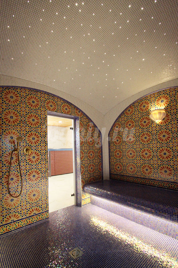 Была выполнена отделка хамам в городе Истра. Установлен парогенератор фирмы EOS. Конструктив сделан из панелей WEDI. Подсветка потолка выполнена в стиле звездное небо. Курна сделана из мрамора. Краны для воды сделаны из бронзы. Освещение лежаков сделано из светодиодной ленты.