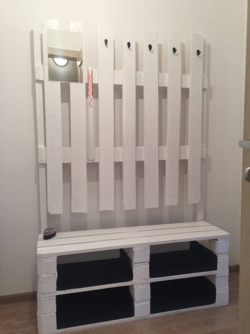 В прихожей сумели сотворить вот такую вешалку, разместив на ней крючки и даже небольшое зеркало в углу. Внизу сделали обувницу, заблаговременно постелив коврики на поверхности, чтобы сохранить чистоту белого цвета.