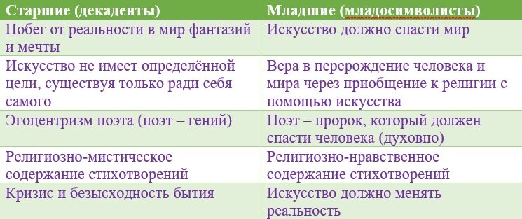 Первый – «старшие символисты», которые подразделяются на две школы: