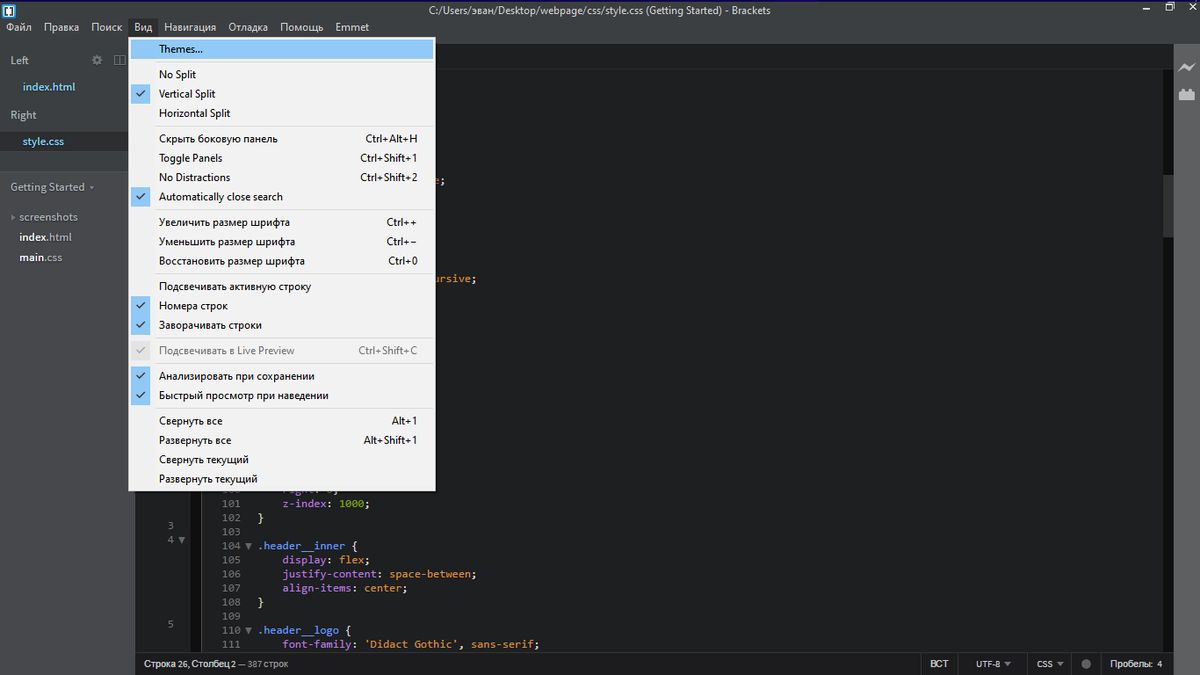 Начать хочется именно с этого пункта, так как тут есть о чем поговорить. Стандартное оформление очень удобное, и новичкам лучше начинать с него, так как там проще ориентироваться в коде. Единственное, можете изменить фоновой цвет на темную тему. Нажимаем на кнопку "Вид" в верхнем меню, а затем раздел "Themes"