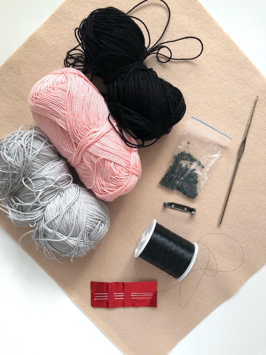 - Пряжа трех цветов «ирис», «мия», «ализе Форевер» или любая другая тонкая хлопковая пряжа (у меня это розовый, черный и серый)