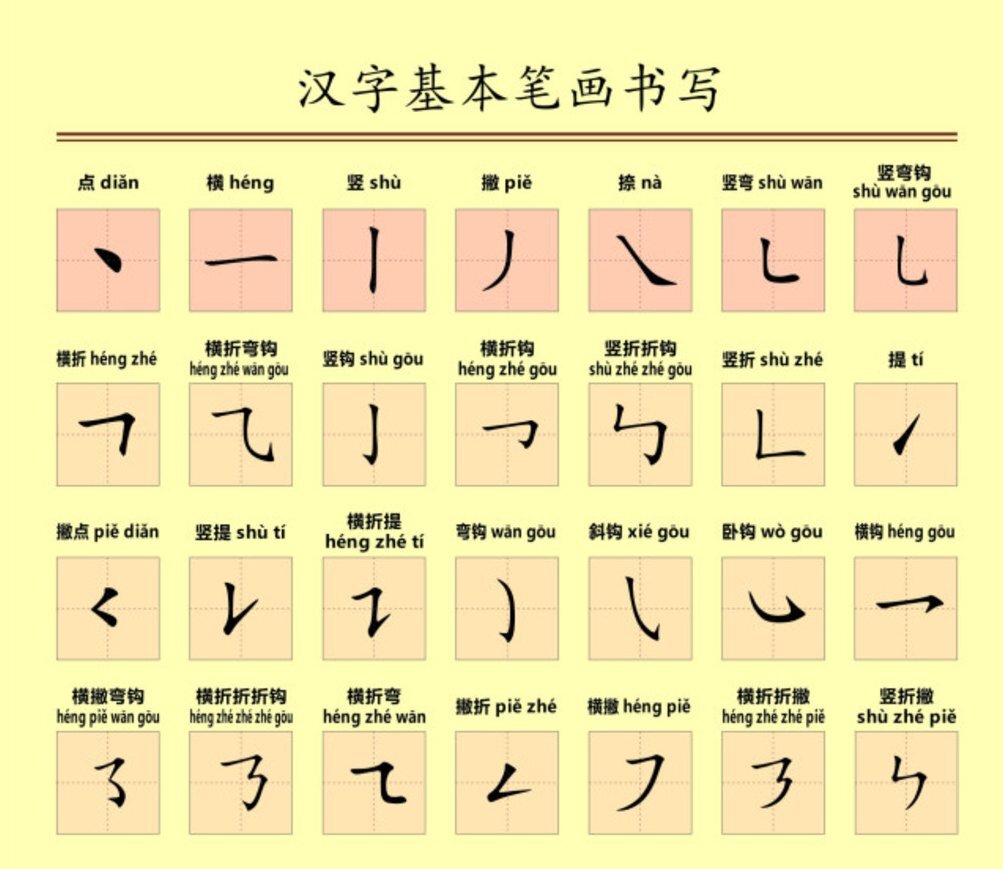 Все китайские иероглифы состоят из 28 черт, которые вы можете увидеть на картинке ниже