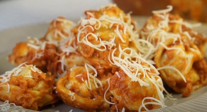 - Потрясите форму, чтобы соус проник между пельменями полностью.
