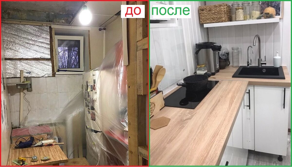 Эта кухня яркий пример того, как люди, задавшись целью, могут из ужасного страшного помещения сделать красивое и функциональное.