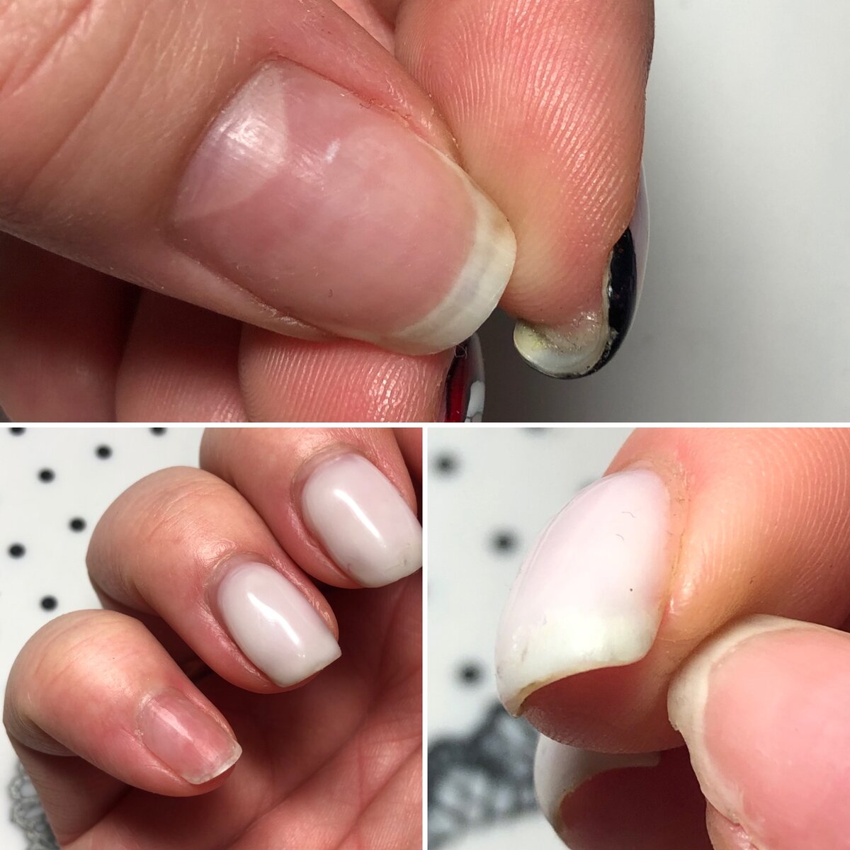 Большие пальцы совсем потеряли покрытие, как и мизинец, которое просто слезло пленкой. Так же топ слезал пленкой и потеряла некоторые углы свободного края. Их буду наращивать акригелем.