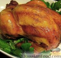 (В процессе запекания можно обмазывать курицу небольшим количеством майонеза или сметаны и поливать образовавшимся соком два-три раза, примерно через каждые 10 минут.)
