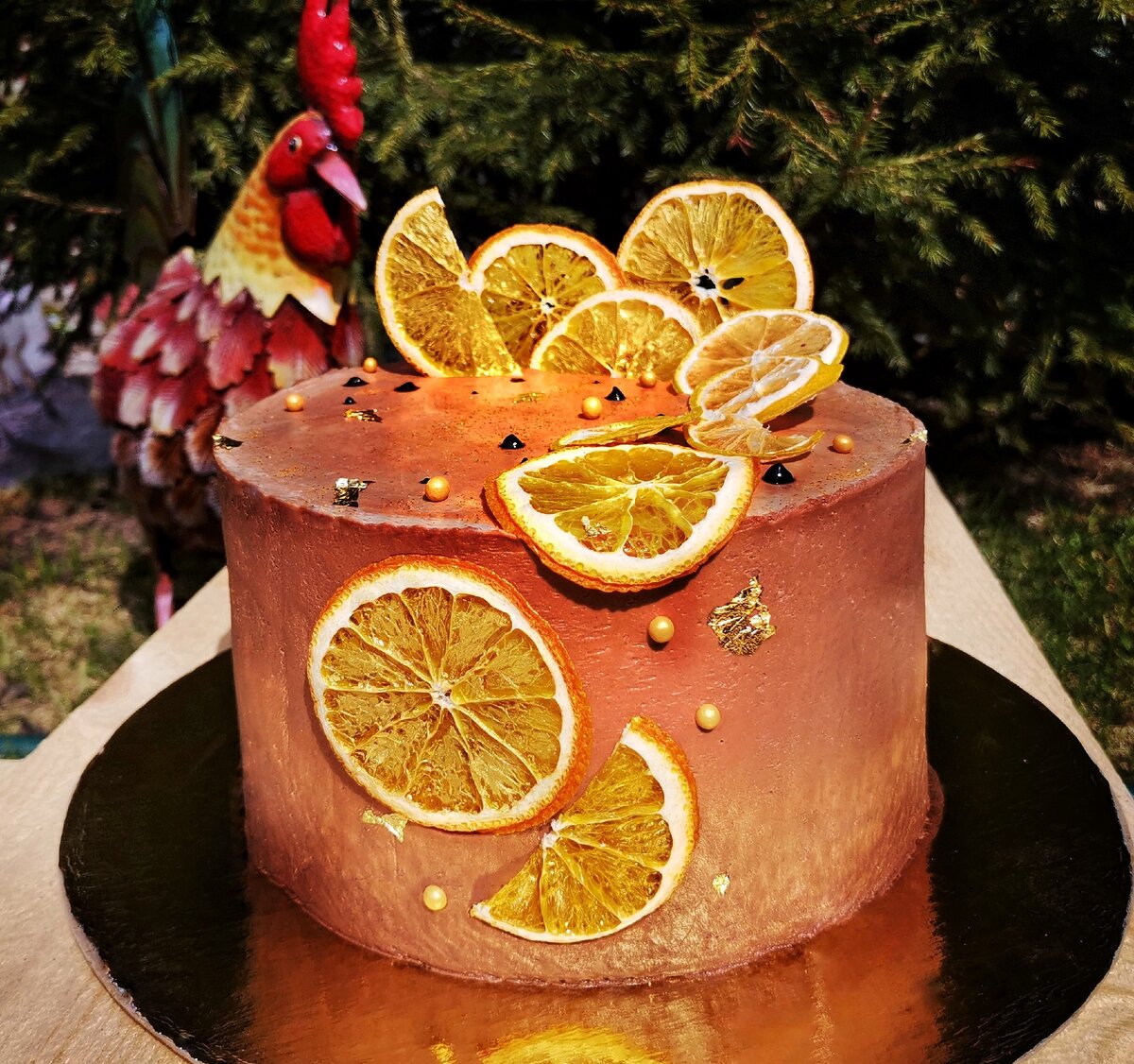 Шоколадные коржи, между которыми изумительный шоколадный мусс, с прослойкой из мандаринового конфи и мандаринового кремё, покрыто шоколадным кремом-чиз! Супер шоколадно, но очень воздушно и не приторно-сладко!)
