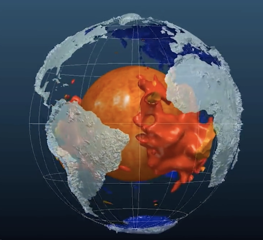 В тысячах километров под поверхностью Земли расположены два огромных образования, происхождение которых никто не может понять. Учёные называют их "пузырями" и имеют все основания предполагать, что они оказывают огромное влияние на процессы, происходящие внутри нашей планеты. Это во всех отношениях гигантская загадка, над которой исследователи ломают головы вот уже более 40 лет. "Пузыри" получили своё не очень благозвучное название благодаря форме - они выглядят как неправильной формы капли с толстыми округлыми выростами. Их научное название - "Крупные области с низкой скоростью сдвига". Сложновато, не правда ли? Но оно говорит, в частности, о том, что волны, несущие какую-либо энергию, замедляются, проходя сквозь них. Таинственные сгустки различных пород изображены с помощью волн от землетрясений (модель из French and Romanowicz, 2015, Nature). Автор: Ed Garnero, Hongyu Lai, Arizona State University