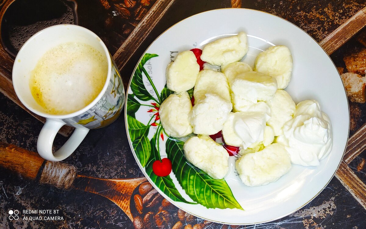 Соединяем творог, яйца, подсластитель и 20 грамм муки. Остальную муку высыпаем в тарелку и формируем из получившейся массы колбаску. Режем ее на кусочки и варим в подсоленной воде 5-7 минут.